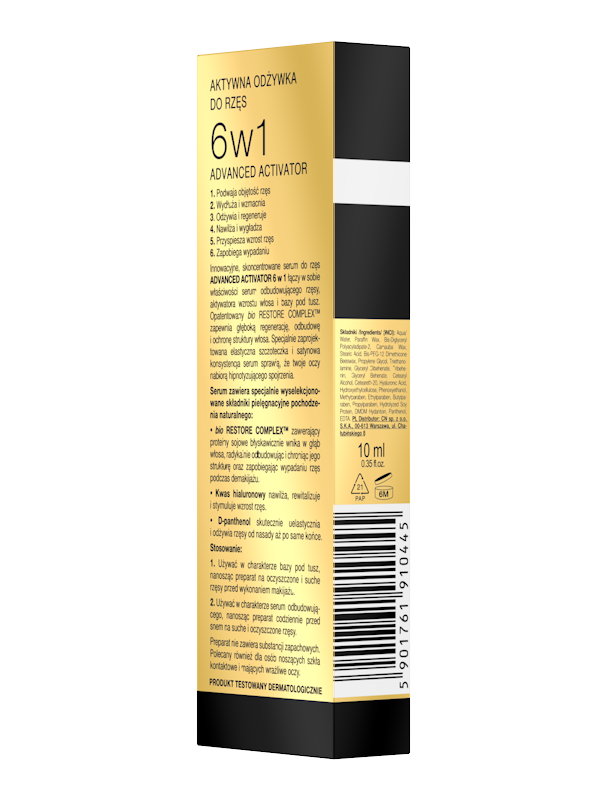 Le concentré du sérum innovant pour les cils ADVANCED ACTIVATOR 6 in 1 marie ensemble le sérum régénérant des cils, l'activateur de la pousse des cheveux et la base sous le mascara. BIO RESTORE COMPLEX ™ breveté asure la régénération et la reconstruction profonde et la protéction structurale des cheveux. La synergie de la brosse élastique avec la texture satinée du sérum, promet que tes yeux obtiendront un regard hypnotique.